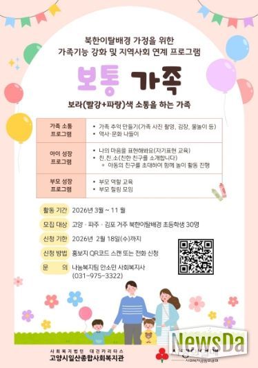 뉴스다 최광묵 기자 | 고양시일산종합사회복지관이 북한이탈배경 가정의 가족기능 강화 및 지역사회 통합 프로그램 ‘보통 가족’의 참여자를 이달 18일까지 모집한다.