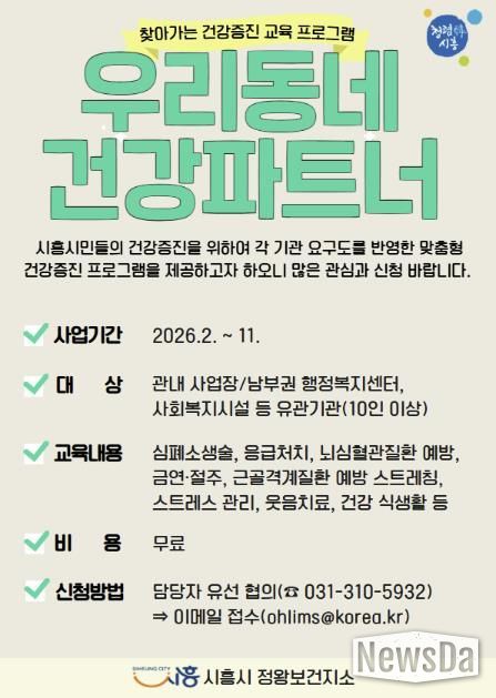 뉴스다 최광묵 기자 | 시흥시는 시간적ㆍ거리적 제약으로 건강증진 서비스를 이용하기 어려운 시민들을 위해 2월부터 11월까지 찾아가는 건강증진 프로그램 ‘우리동네 건강파트너’를 운영한다.
