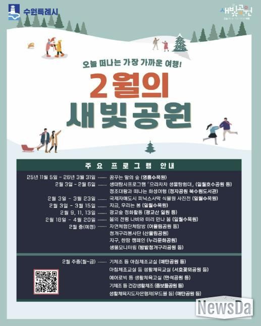 수원시 관계자는 “겨울철에도 시민들이 공원을 찾으며 자연과 교감하고 건강한 여가를 즐길 수 있도록 다양한 프로그램을 마련했다”며 “공원이 일상에서 더 친근한 생활 공간으로 자리 잡을 수 있도록 지속해서 노력하겠다”고 말했다.