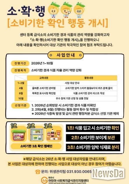 주요 내용은 ▲‘소비기한 3초 확인 캠페인’▲상·하반기 소비기한 자율 점검 안내 문자 발송 ▲소비기한 관리 교육자료 제공 및 과제 활동 등이다. 아울러 2026년 순회 방문 기간 동안 수행 과제를 성실히 이행한 기관에는 연말에 소정의 상품을 지급할 예정이다.