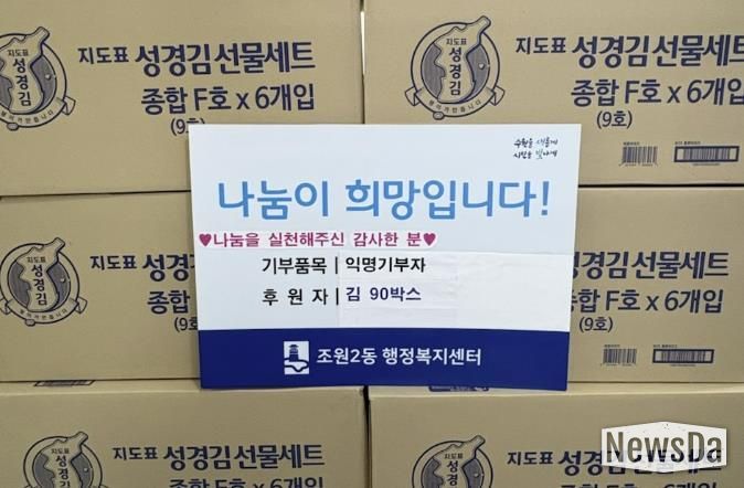 뉴스다 최광묵 기자 | 수원시 장안구 조원2동은 지난 3일, 설 명절을 맞아 익명의 기부자가 김 81박스를 기탁해 지역사회에 따뜻한 온정을 전했다고 밝혔다.