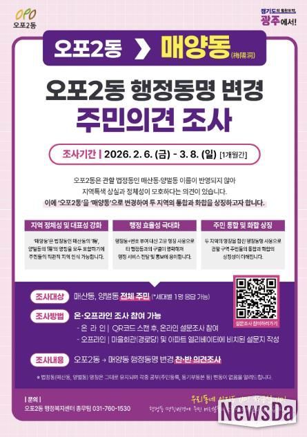 뉴스다 최광묵 기자 | 광주시 오포2동은 지역 정체성을 반영한 행정동 명칭 변경을 위해 2월 6일부터 3월 8일까지 오포2동 전 세대를 대상으로 주민 의견 조사를 실시한다고 4일 밝혔다.
