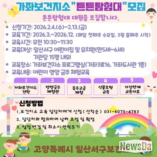 교육 대상은 일산서구 관내 어린이집 및 유치원에 재원 중인 만 5~6세 유아로 기관 당 약 15명 내외가 참여할 수 있다. 교육은 가좌보건지소 프로그램실(가좌3로 16, 가좌도서관 1층)에서 오전 10시 30분부터 11시 30분까지 운영된다.