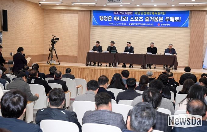 뉴스다 류대현 기자 | 광주광역시는 4일 올림픽기념국민생활관에서 광주체육 관계자 180여 명이 참석한 가운데 ‘광주전남 통합 체육 분야 시민공청회’를 개최했다.