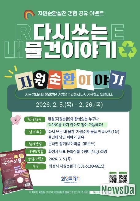 뉴스다 최광묵 기자 | 화성특례시는 시민들이 일상에서 실천하고 있는 자원순환 경험을 공유하는 참여형 캠페인 '다시쓰는 내 물건 이야기' 를 운영한다.