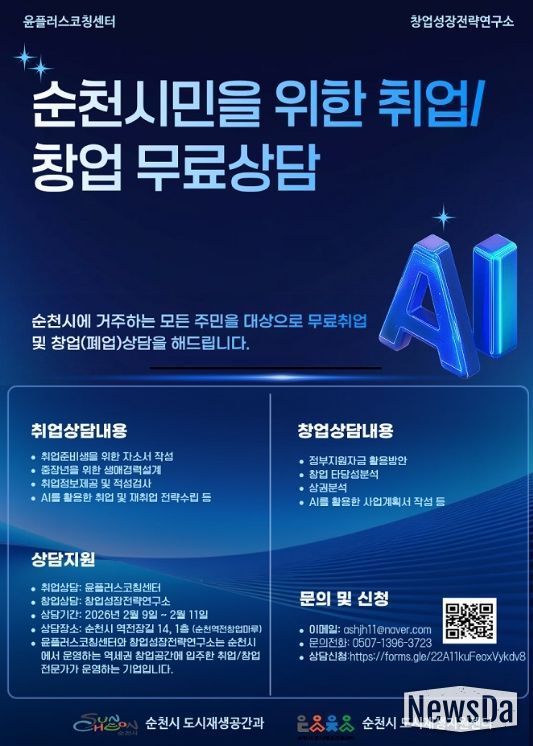 뉴스다 최광묵 기자 | 순천시는 순천역전 창업마루(도시재생 거점시설)에 입주한 창업컨설팅 전문기업 주관으로 ‘취업·창업 무료상담’을 진행할 예정이다.