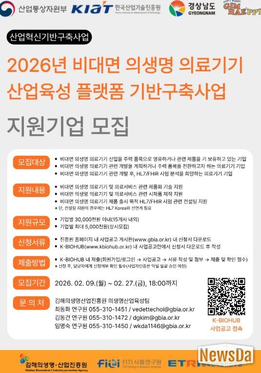뉴스다 최광묵 기자 | 김해의생명산업진흥원은 산업통상부와 한국산업기술진흥원이 주관하는 '비대면 의생명 의료기기 산업육성 플랫폼 기반구축사업'의 수혜기업 모집을 2월 9일부터 시작한다고 밝혔다.
