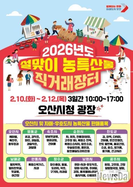 뉴스다 최광묵 기자 | 오산시는 설 명절을 맞아 오는 2월 10일부터 12일까지 3일간, 오전 10시부터 오후 5시까지 오산시청 광장에서 자매·우호도시와 함께하는 ‘설맞이 농특산물 직거래장터’를 개최한다고 밝혔다.