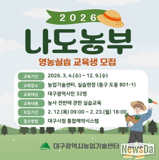 뉴스다 최광묵 기자 | 대구광역시농업기술센터(소장 김수진)는 3월 4일부터 12월 9일까지 농업 경영 실습을 희망하는 대구시민을 대상으로 ‘2026년 나도 농부’ 영농실습교육을 추진한다.