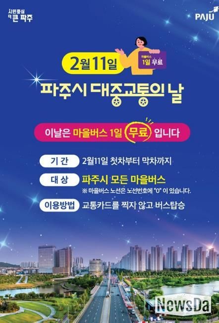 뉴스다 최광묵 기자 | 파주시는 ‘대중교통의 날’을 맞아 대중교통 이용 활성화와 시민 교통비 부담 완화를 위해 오는 2월 11일 하루 동안 파주시 전 지역의 모든 마을버스를 무료로 운행한다.