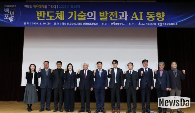 뉴스다 최광묵 기자 | 전북연구원(원장 최백렬)은 10일 오전 8시, 전북특별자치도청 4층 대회의실에서 싱가포르 난양공과대학교 채상훈 교수를 초청해 ‘반도체 기술의 발전과 AI 동향’을 주제로 '전북 백년포럼'을 개최했다. 채 교수는 반도체 전문가로, 2026년 1월 ‘자랑스런 전북인상'을 수상했다.