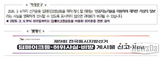 뉴스다 최광묵 기자 | 중앙선거관리위원회는 6월 3일 실시하는 제9회 지방선거를 앞두고 유권자 중심의 깨끗한 사이버 선거문화 조성을 위해 2월 3일부터 ‘사이버선거문화 자정캠페인’을 추진 중이라고 밝혔다.