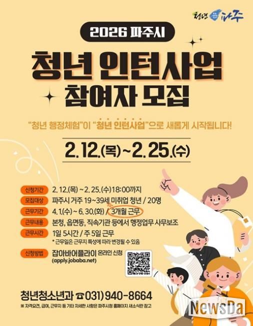 뉴스다 최광묵 기자 | 파주시는 관내 미취업 청년을 대상으로 운영하던 ‘청년 행정체험’사업을 올해부터 ‘청년 인턴사업’으로 개편하고, 근무기간을 기존 20일에서 3개월로 연장해 확대 운영한다.