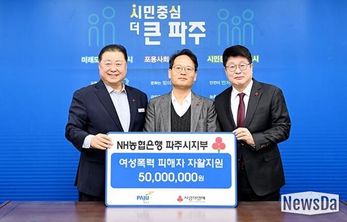 뉴스다 최광묵 기자 | 파주시는 지난 11일 엔에이치(NH)농협은행 파주시지부가 여성폭력 피해자의 자립과 회복을 지원하기 위한 후원금 5천만 원을 기탁했다고 밝혔다.