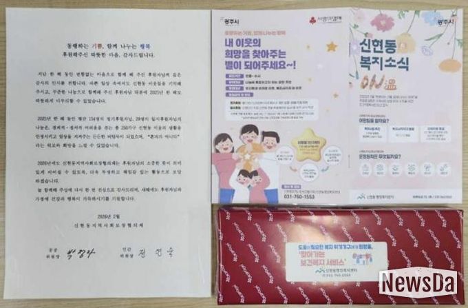 뉴스다 최광묵 기자 | 광주시 신현동 지역사회보장협의체는 2025년 한 해 동안 신현동 내 어려운 이웃을 위해 성금과 물품을 기부한 후원자 183명에게 감사 서한을 발송했다고 12일 밝혔다.