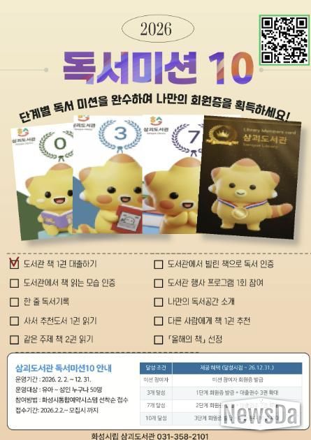 뉴스다 최광묵 기자 | 화성시립삼괴도서관은 시민들의 자발적인 독서 참여와 일상 속 독서습관 형성을 위해 ‘2026년 삼괴도서관 독서미션10’을 2월부터 12월까지 운영할 예정이다.