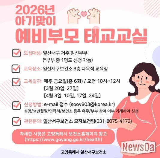 뉴스다 최광묵 기자 | 고양특례시 일산서구보건소는 2026년 아이를 맞이하는 예비부모의 건강한 임신과 출산을 위해 ‘예비부모 태교교실’을 운영한다.