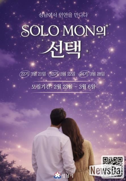 뉴스다 최광묵 기자 | 성남시는 오는 2월 23일부터 3월 6일까지 ‘솔로몬(SOLO MON)의 선택’ 22~24기 행사 참가 희망자 300명(남녀 각 150명)을 모집한다.
