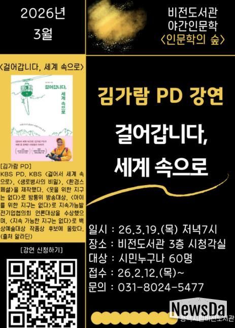 뉴스다 최광묵 기자 | 평택시 비전도서관은 3월 19일 저녁 7시 김가람 KBS PD를 초청하여 ‘걸어갑니다, 세계 속으로’를 주제로 야간 인문학 강연을 진행한다.