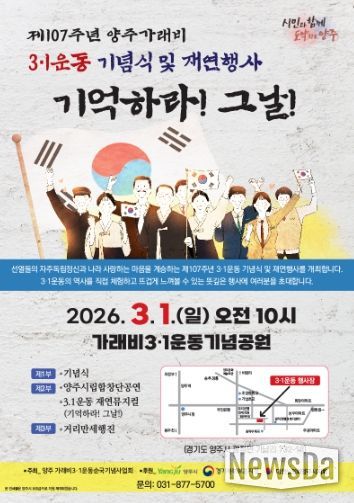 양주시 관계자는 “제107주년을 맞아 열리는 이번 기념 행사가 선열들의 희생과 애국정신을 다시 한번 마음에 새기는 계기가 되길 바란다”며 “많은 시민들이 함께해 자랑스러운 우리 고장의 역사를 기억하고, 그 정신을 미래 세대에 이어가는 소중한 시간이 되길 기대한다”고 전했다.