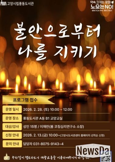 뉴스다 최광묵 기자 | 고양특례시 풍동도서관은 오는 2월 28일 오전 10시부터 12시까지 풍동도서관 A동 지하 1층 교양교실에서 공공도서관 독서문화 프로그램 ‘불안으로부터 나를 지키기’를 운영한다.