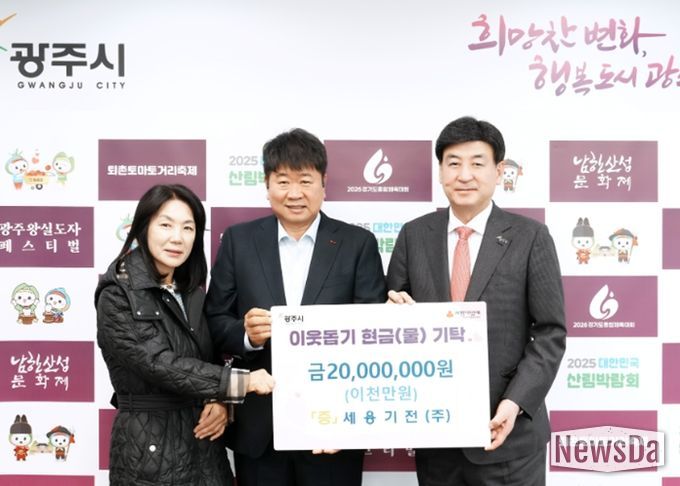 뉴스다 최광묵 기자 | 세용기전㈜ 안승용 대표는 13일 설 명절을 맞아 지역 내 어려운 이웃을 위해 사용해 달라며 성금 2천만 원을 광주시에 기탁했다.