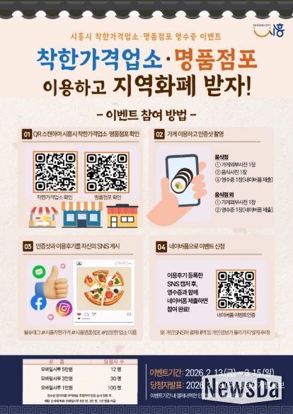 뉴스다 최광묵 기자 | 시흥시는 착한가격업소ㆍ명품점포 활성화와 설 명절 지역 물가안정을 위해 ‘2026년 상반기 착한가격업소ㆍ명품점포 방문 이벤트’를 2월 13일부터 3월 15일까지 진행한다.