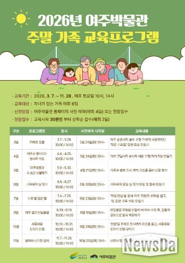 뉴스다 최광묵 기자 | 여주시 여주박물관은 오는 3월 7일부터 11월 28일까지 매주 토요일, 가족 단위 관람객을 대상으로 한 ‘2026년 주말 가족 대상 교육프로그램’을 운영한다.
