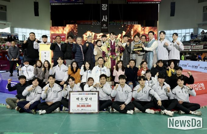 뉴스다 류대현 기자 | 영암군민속씨름단 김민재 장사가 18일 충남 태안종합실내체육관에서 열린 ‘2026 위더스제약 태안설날장사씨름대회’ 140kg 이하 백두급에서 우승하며 설날장사 타이틀을 거머쥐었다.