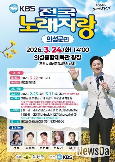 뉴스다 최광묵 기자 | 의성군은 군민들에게 활력을 불어넣고 소통과 화합의 장을 마련하기 위해 오는 3월 24일 오후 2시, 의성종합체육관 광장에서 ‘KBS 전국노래자랑 - 의성군 편’을 개최한다고 밝혔다.