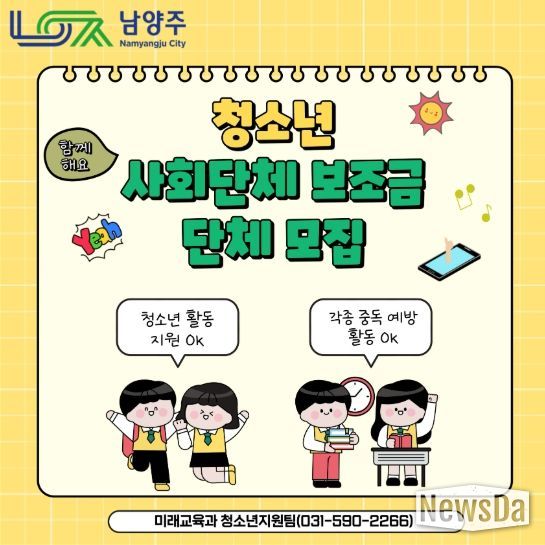 뉴스다 최광묵 기자 | 남양주시는 2월 20일부터 3월 6일까지 청소년의 권리 증진과 다양한 활동 지원을 위해 ‘청소년 사회단체 보조금 공모사업’을 신청받는다.