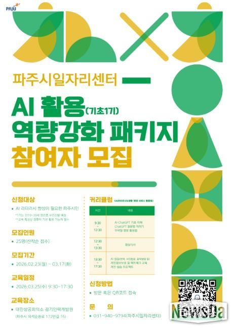 뉴스다 최광묵 기자 | 파주시는 파주시 일자리센터를 통해 경기인력개발원에서 운영하는 ‘인공지능(AI) 실무교육 1기’과정의 참여자 25명을 모집한다. 모집 기간은 2월 23일부터 3월 17일까지다.