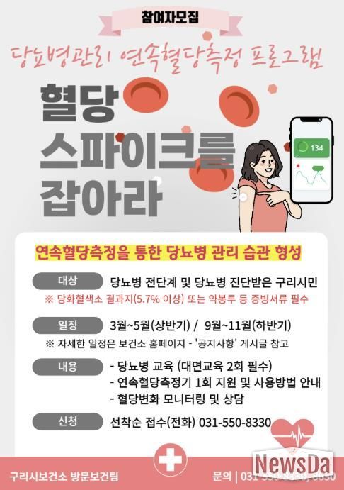 뉴스다 최광묵 기자 | 구리시 보건소는 2월 23일부터 당뇨병관리 연속혈당측정 프로그램 '혈당 스파이크를 잡아라'의 참여자를 모집한다고 밝혔다.