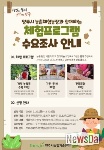 뉴스다 최광묵 기자 | 양주시가 학생들이 교실을 벗어나 자연 속에서 농업의 가치를 체험할 수 있도록 ‘2026년 농촌사랑 자연체험 학습 지원사업’을 확대 운영한다.