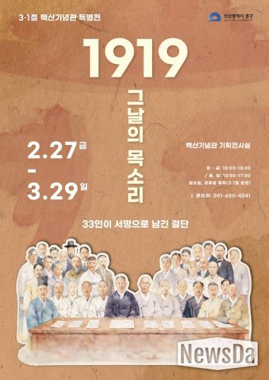 뉴스다 최광묵 기자 | 부산 중구는 제107주년 3·1절을 맞아 오는 2월 27일부터 3월 29일까지 백산기념관 기획전시실에서 '1919 그날의 목소리, 33인이 서명으로 남긴 결단'특별전을 개최한다.