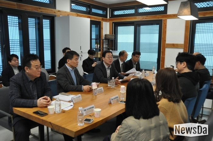 ▲정명근 화성특례시 시장이 동탄 유통3부지 관련 비대위 위원에게 최종 반려에 대한 설명을 하며 대화를 나누고 있다.(사진제공=뉴스다)