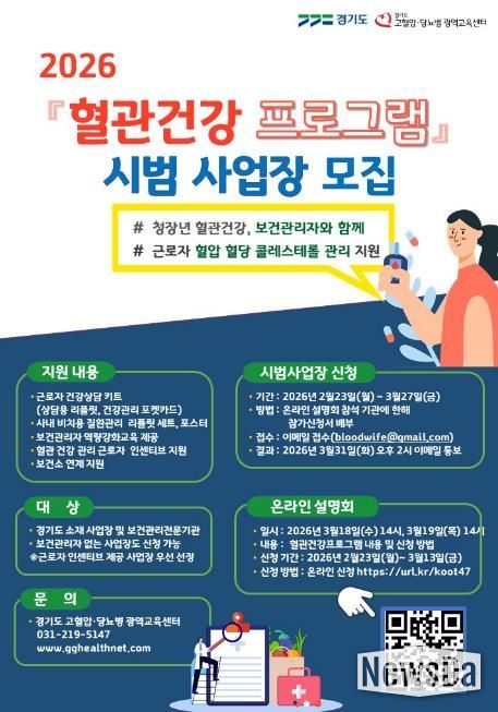 혈관건강 프로그램 시범운영 사업장 모집은 2월 23일부터 3월 27일까지 진행된다. 온라인 설명회는 3월 18~19일 이틀간 개최하며, 최종 선정된 사업장은 3월 31일 발표한다. 구체적인 프로그램 내용 및 신청방법은 온라인 설명회에서 재차 안내할 예정이다.