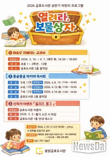뉴스다 최광묵 기자 | 광양금호도서관은 봄을 맞아 어린이와 가족을 위한 예술 연계 독서·체험 프로그램 '열려라, 보물상자'를 운영하고 수강생을 모집한다.