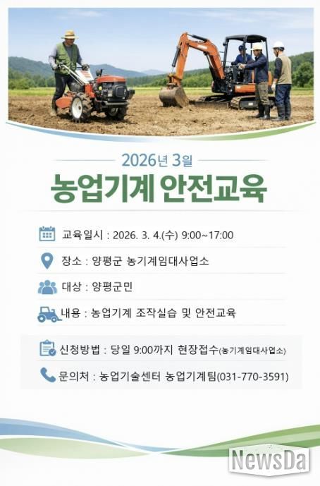 뉴스다 최광묵 기자 | 양평군은 농업인의 안전한 영농활동을 지원하기 위해 3월부터 12월까지 매월 첫째 주 수요일에 양평군 농기계임대사업소에서 농업기계 안전교육을 실시한다고 밝혔다. 이번 교육은 농업기계 사용 중 발생할 수 있는 각종 사고를 예방하고, 올바른 사용 방법과 관리 요령을 안내하기 위해 마련됐다.