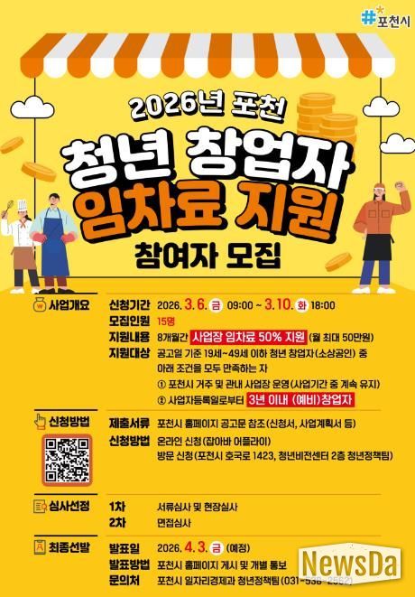 뉴스다 최광묵 기자 | 포천시는 청년 창업자의 안정적인 창업 환경 조성과 창업 지속 가능성 제고를 위해 '2026년 청년 창업자 임차료 지원사업' 참여자를 2026년 3월 6일부터 10일까지 모집한다.
