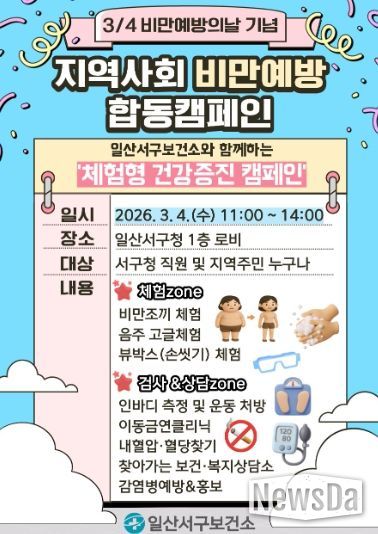 뉴스다 최광묵 기자 | 고양특례시 일산서구보건소가 비만예방의 날을 맞아 오는 3월 4일 보건복지부, 한국건강증진개발원과 함께하는 ‘2026년 지역사회 비만예방 합동캠페인’을 전개한다.