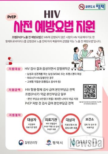 뉴스다 최광묵 기자 | 평택시는 감염 취약군을 대상으로 에이즈 바이러스(이하 HIV) 감염을 예방하기 위한 ‘노출 전 예방요법(Pre-Exposure Prophylaxis, 이하 PrEP)’을 지원한다고 밝혔다.