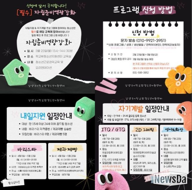 뉴스다 최광묵 기자 | 남양주시는 학교밖청소년지원센터가 관내 학교 밖 청소년의 진로 탐색과 역량 강화를 위한 ‘자립준비 역량강화 프로그램’에 참여할 청소년을 모집한다고 25일 밝혔다.