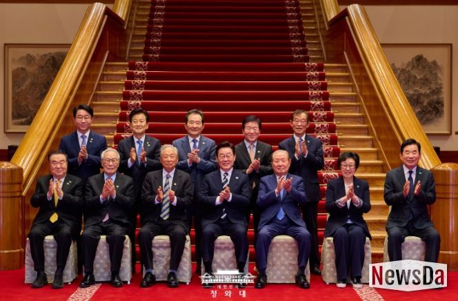뉴스다 최광묵 기자 | 이재명 대통령은 오늘 청와대 본관에서 1시간 45분 동안 민주당 상임고문 열 분과 오찬 간담회를 가졌다. 참석자는 권노갑 고문과 김원기·임채정·문희상·김진표·정세균·박병석 전 국회의장, 한명숙 전 총리, 정동영 통일부 장관, 이용득 고문이다.