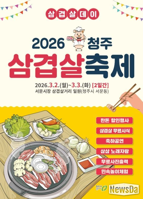 뉴스다 최광묵 기자 | 청주시는 지역 유일 음식특화거리인 상당구 서문시장 삼겹살거리를 알리기 위해 ‘2026년 3·3데이 청주 삼겹살 축제’를 오는 3월 2일부터 3일까지 삼겹살거리 일원에서 개최한다.