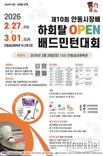뉴스다 류대현 기자 | 『제10회 안동시장배 하회탈 OPEN 배드민턴대회』가 오는 2월 27일부터 3월 1일까지 3일간 안동체육관과 안동다목적체육관에서 개최된다.