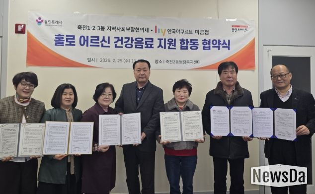 뉴스다 최광묵 기자 | 용인특례시 수지구 죽전1·2·3동 지역사회보장협의체는 25일 죽전2동 행정복지센터에서 ㈜hy 미금점과 ‘홀로어르신 건강음료 지원’ 사업 협약을 체결했다고 26일 밝혔다.