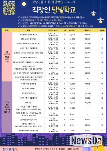 뉴스다 최광묵 기자 | 화성특례시는 2월 26일부터 3월 6일까지 직장인 달빛학교 1차 수강생을 선착순으로 모집한다고 밝혔다.