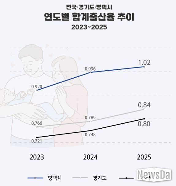 국가데이터처가 발표한 2025년 잠정 합계출산율에 따르면 평택시는 2024년 0.996에서 2025년 1.02로 상승하며 다시 1.0명을 넘어섰다. 2023년(0.92) 이후 2년 연속 상승이다.