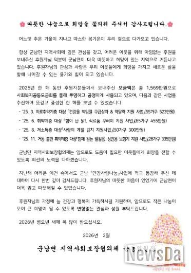 뉴스다 최광묵 기자 | 군남면지역사회보장협의체는 지난 한 해 동안 지역 내 소외된 이웃을 위해 따뜻한 나눔을 실천해 준 후원자들에게 감사 서한문을 지난 25일 발송했다.